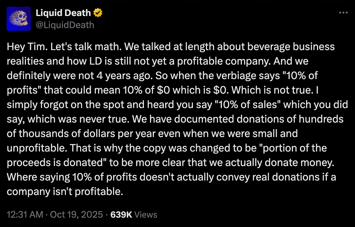 On one of his rants, he unfortunately admitted that their claim that they donate “10% of profits” to reduce plastic waste isn’t important because… they aren’t profitable.